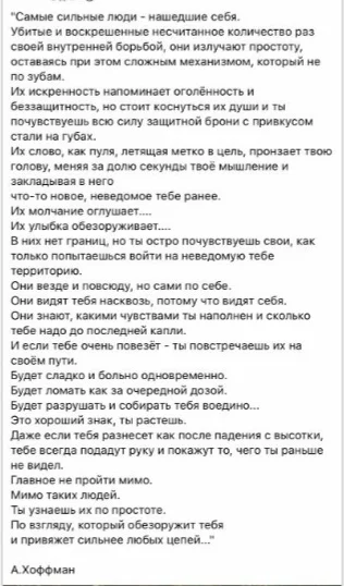 What is the strength of a man? ..... When a woman feels safe. When there is boundless trust. When in the evening she falls asleep in his arms as in a baby's cradle. When in the morning strong male hands squeeze her in an embrace. When it melts from hot palms like a piece of ice. В чем сила мужчины? ..... Когда женщина чувствует себя в безопасти. Когда есть безграничное доверие. Когда вечером она засыпает в его руках как в детской колыбели. Когда утром сильные мужские руки сжимают ее в объятиях . Когда она тает от горячих ладоней как льдинка.